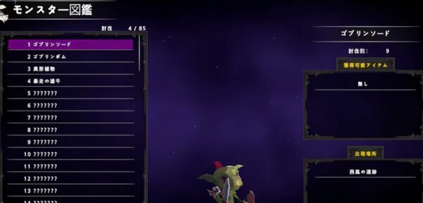 モンスター図鑑があり、これらをコンプリートするのも楽しい。????と出ているモンスター名を少しずつ開放していこう。