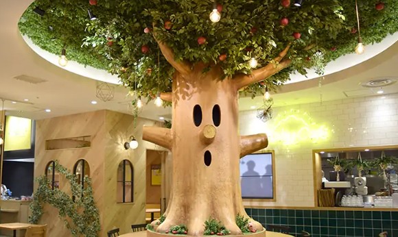 優しい木漏れ日を感じるような店内には、おなじみの「ウィスピーウッズ」が中央にそびえ立ち、訪れる人々を見守っています。店内のBGMもカービィのアレンジ楽曲が使われており、細部にまでこだわりが詰まっています。