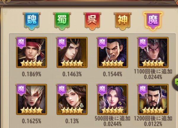 魔・貂蝉と魔・祝融の二名で間違いありません。ただ、残念なことに、このゲームは1200回やらないと手に入らない最強武将も存在しています。ですから、リセマラをやるのはほぼ無意味な無理ゲー。